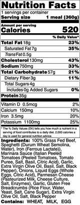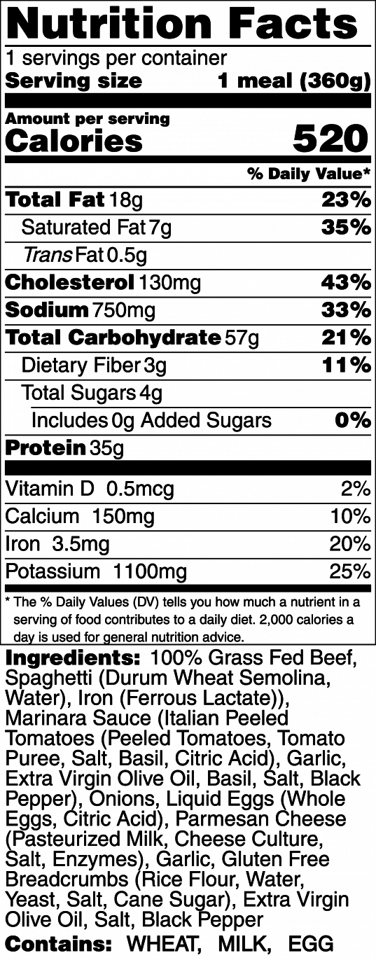 100% Grass Fed Beef, Spaghetti (Durum Wheat Semolina, Water), Marinara Sauce (Italian Peeled Tomatoes (Peeled Tomatoes, Tomato Puree, Salt, Basil, Citric Acid), Garlic, Extra Virgin Olive Oil, Basil, Salt, Black Pepper), Onions, Liquid Eggs (Whole Eggs, Citric Acid), Parmesan Cheese (Pasteurized Milk, Cheese Culture, Salt, Enzymes), Garlic, Gluten Free Breadcrumbs (Rice Flour, Water, Yeast, Salt, Cane Sugar), Extra Virgin Olive Oil, Salt, Black Pepper
