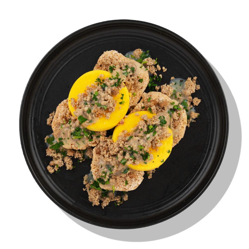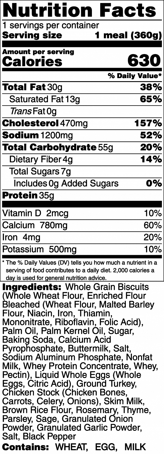 Two whole grain biscuits and two baked egg patties topped with our homemade lean turkey sausage gravy.
