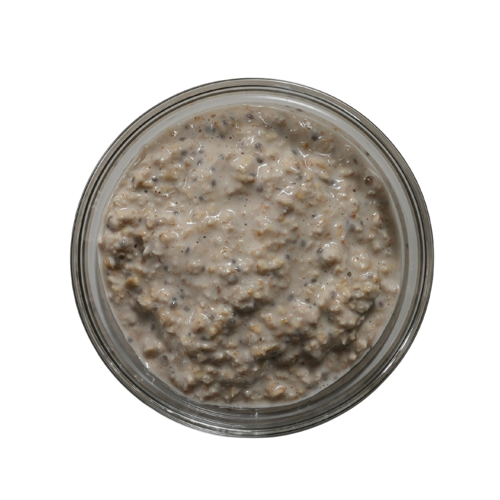 Whole grain rolled oats and chia seeds soaked in almond milk, mixed with nonfat Greek yogurt, brown sugar, and pure maple syrup.