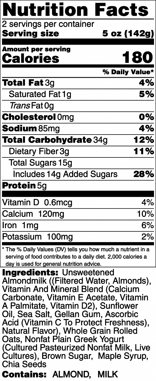 Unsweetened Almondmilk ((Filtered Water, Almonds), Vitamin And Mineral Blend (Calcium Carbonate, Vitamin E Acetate, Vitamin A Palmitate, Vitamin D2), Sunflower Oil, Sea Salt, Gellan Gum, Ascorbic Acid (Vitamin C To Protect Freshness), Natural Flavor), Whole Grain Rolled Oats, Nonfat Plain Greek Yogurt (Cultured Pasteurized Nonfat Milk, Live Cultures), Brown Sugar, Maple Syrup, Chia Seeds
