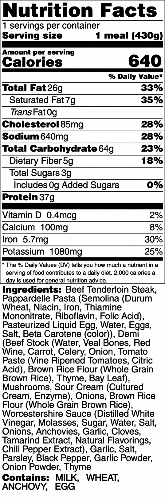 Beef Tenderloin Steak, Pappardelle Pasta (Semolina (Durum Wheat, Niacin, Iron, Thiamine Mononitrate, Riboflavin, Folic Acid), Pasteurized Liquid Egg, Water, Eggs, Salt, Beta Carotene (color)), Demi (Beef Stock (Water, Veal Bones, Red Wine, Carrot, Celery, Onion, Tomato Paste (Vine Ripened Tomatoes, Citric Acid), Brown Rice Flour (Whole Grain Brown Rice), Thyme, Bay Leaf), Mushrooms, Sour Cream (Cultured Cream, Enzyme), Onions, Brown Rice Flour (Whole Grain Brown Rice), Worcestershire Sauce (Distilled White Vinegar, Molasses, Sugar, Water, Salt, Onions, Anchovies, Garlic, Cloves, Tamarind Extract, Natural Flavorings, Chili Pepper Extract), Garlic, Salt, Parsley, Black Pepper, Garlic Powder, Onion Powder, Thyme