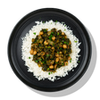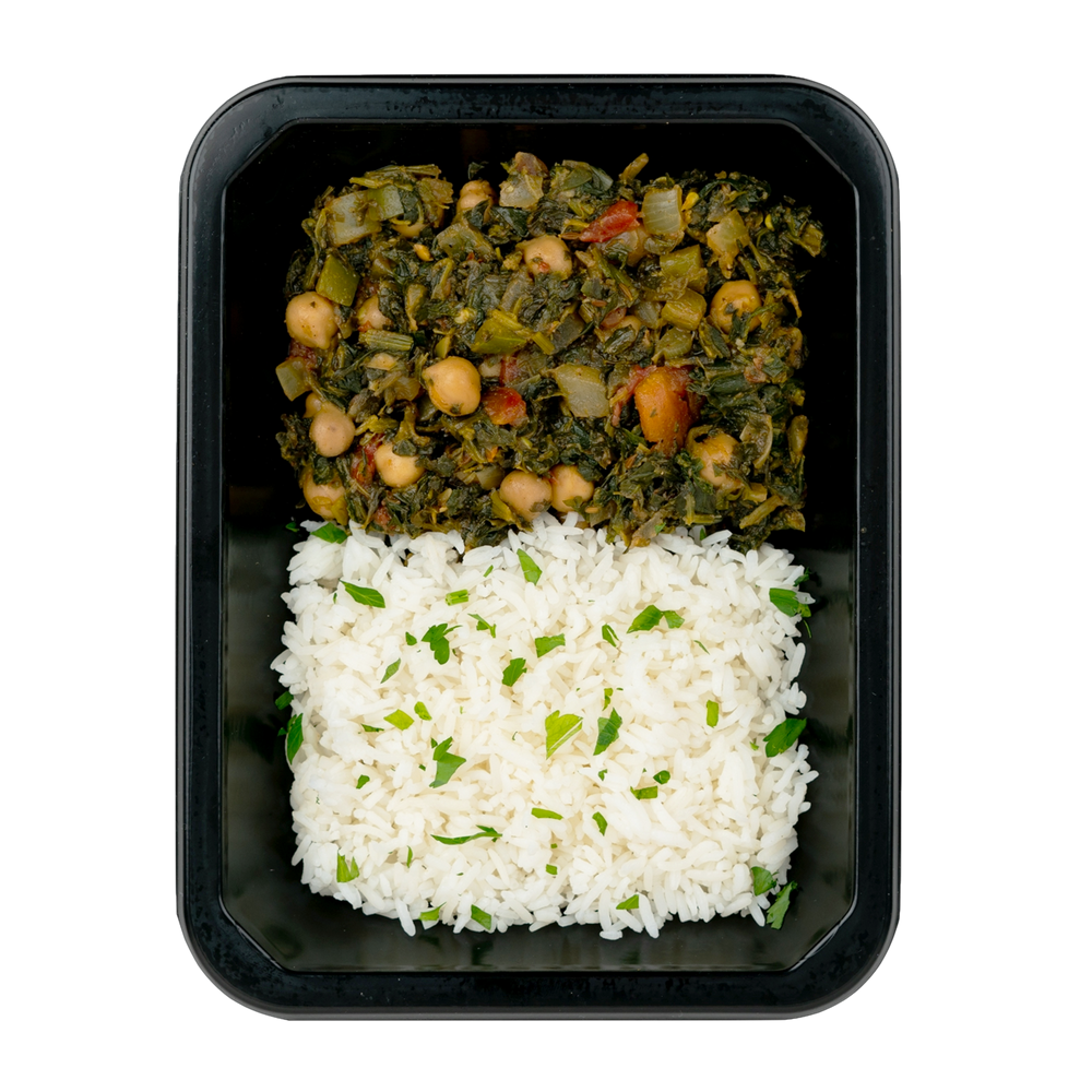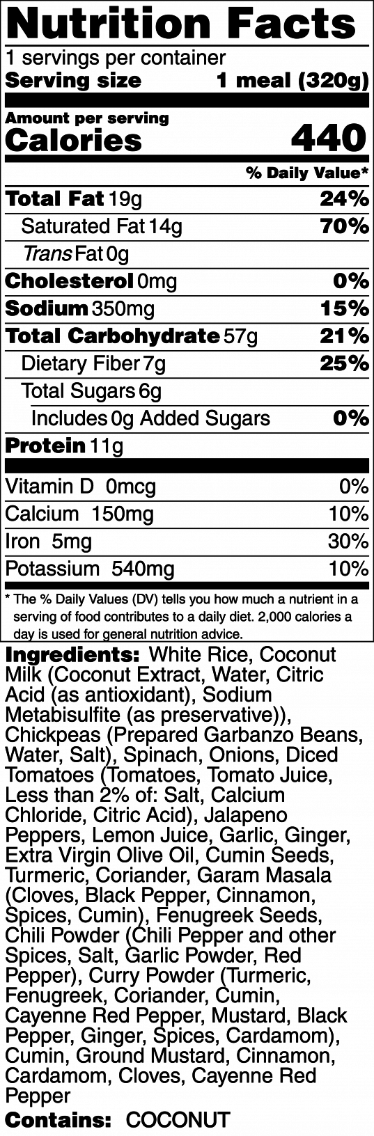 White Rice, Coconut Milk (Coconut Extract, Water, Citric Acid (as antioxidant), Sodium Metabisulfite (as preservative)), Chickpeas (Prepared Garbanzo Beans, Water, Salt), Spinach, Onions, Diced Tomatoes (Tomatoes, Tomato Juice, Less than 2% of: Salt, Calcium Chloride, Citric Acid), Jalapeno Peppers, Lemon Juice, Garlic, Ginger, Extra Virgin Olive Oil, Cumin Seeds, Turmeric, Coriander, Garam Masala (Cloves, Black Pepper, Cinnamon, Spices, Cumin), Fenugreek Seeds, Chili Powder (Chili Pepper and other Spices, Salt, Garlic Powder, Red Pepper), Curry Powder (Turmeric, Fenugreek, Coriander, Cumin, Cayenne Red Pepper, Mustard, Black Pepper, Ginger, Spices, Cardamom), Cumin, Ground Mustard, Cinnamon, Cardamom, Cloves, Cayenne Red Pepper