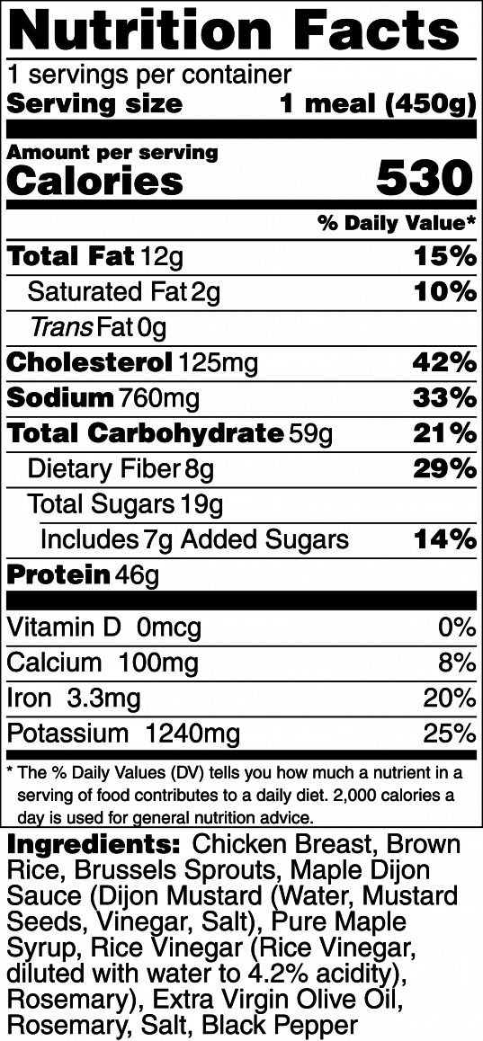 Seared chicken breast finished with a pure maple syrup & Dijon mustard sauce and served with steamed brown rice and delicately roasted Brussels sprouts.