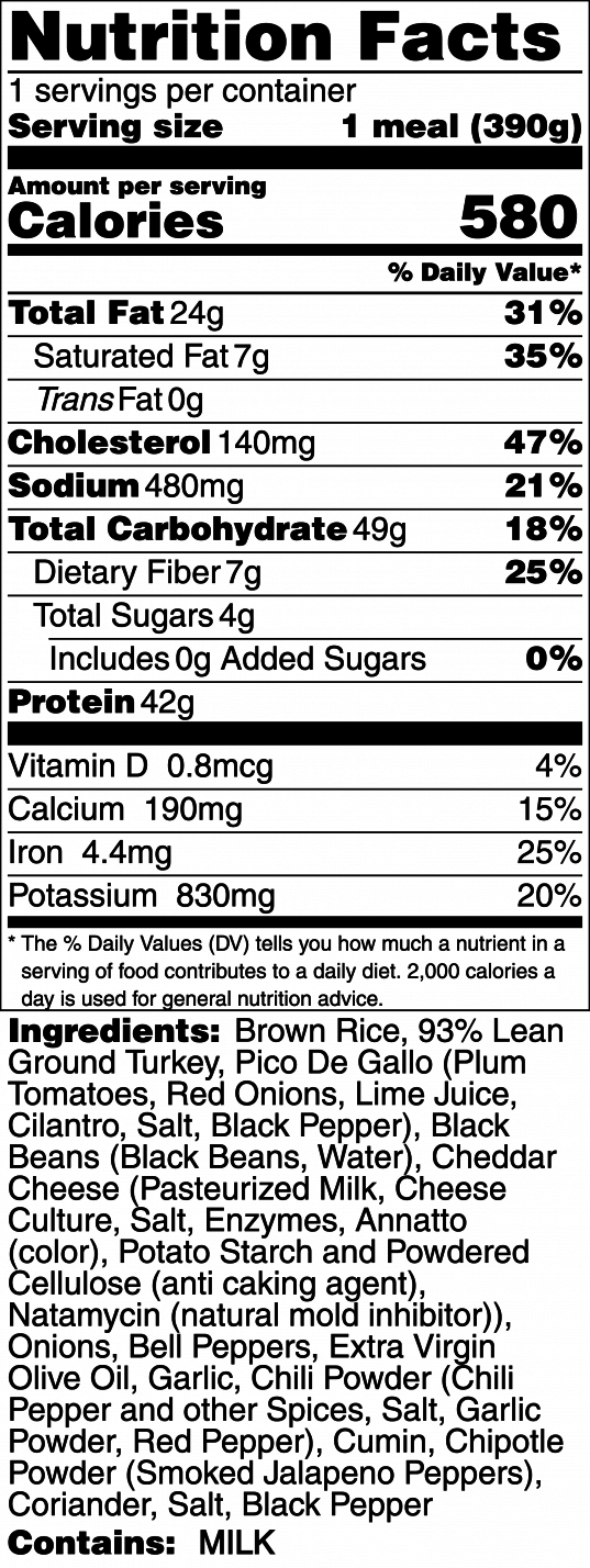 Sautéed lean ground turkey and black beans are slow-simmered with peppers and onions in our secret Mexican spice blend, served over steamed brown rice, topped with shredded cheddar cheese and homemade pico de gallo.