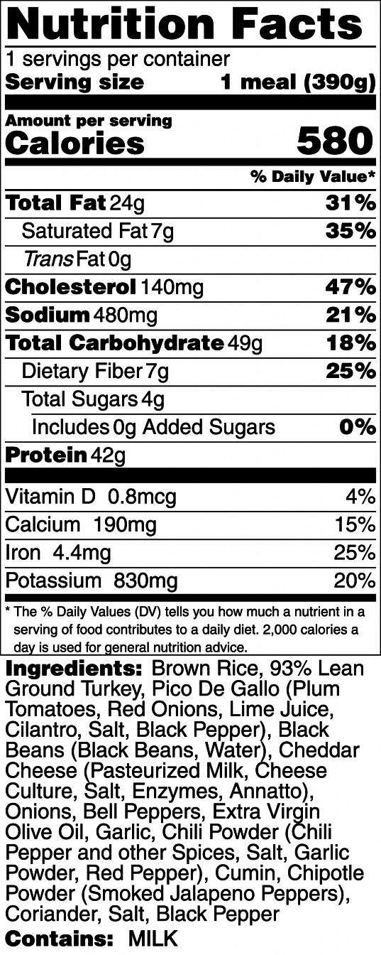 Sautéed lean ground turkey and black beans are slow-simmered with peppers and onions in our secret Mexican spice blend, served over steamed brown rice, topped with shredded cheddar cheese and homemade pico de gallo.