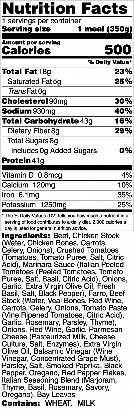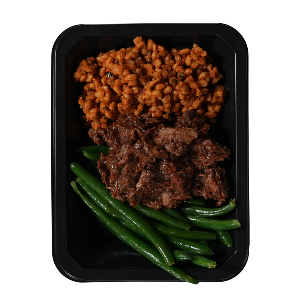 Slow-braised beef in a rich reduction of tomatoes, bone broth, red wine, and spices, creating deep flavor and fork-tender texture. Paired with aromatic tomato-herb farro and steamed green beans.