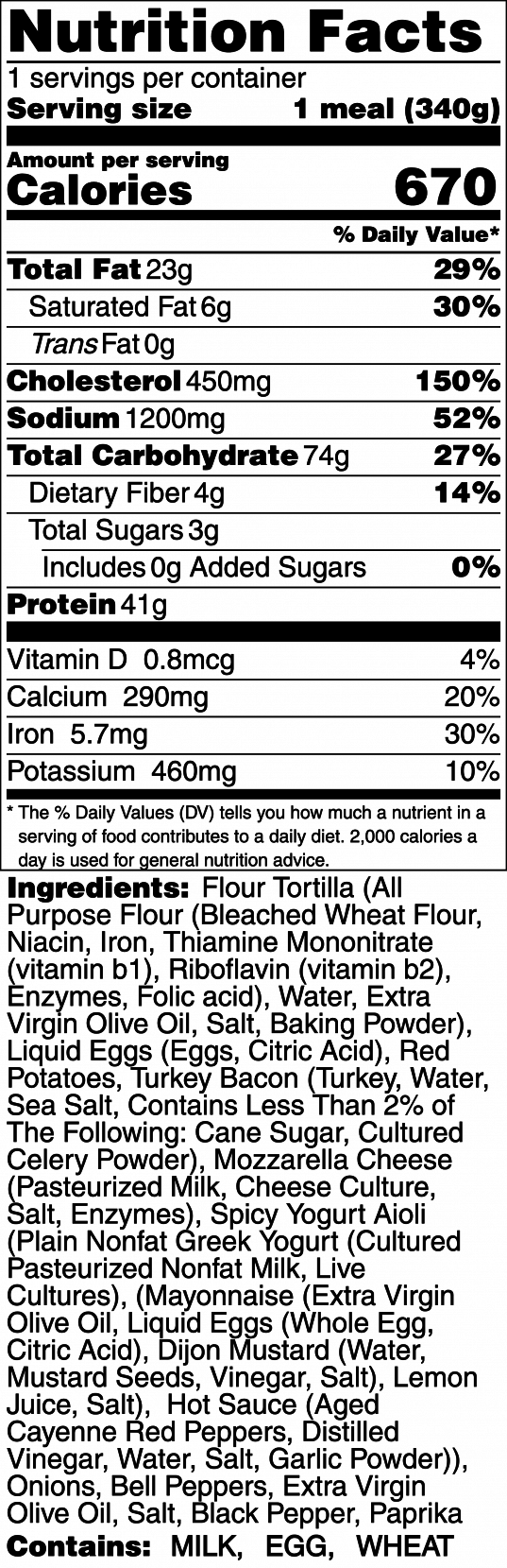 Our Loaded Breakfast Burrito features fluffy scrambled eggs, all-natural turkey bacon, mozzarella cheese, crispy seasoned potatoes, and a kick of spicy yogurt aioli all wrapped up in a homemade flour tortilla.