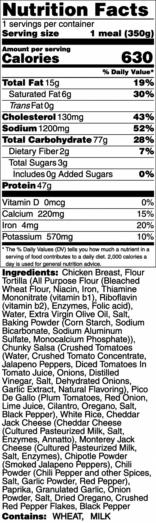 Chicken Breast, Flour Tortilla (All Purpose Flour (Bleached Wheat Flour, Niacin, Iron, Thiamine Mononitrate (vitamin b1), Riboflavin (vitamin b2), Enzymes, Folic acid), Water, Extra Virgin Olive Oil, Salt, Baking Powder (Corn Starch, Sodium Bicarbonate, Sodium Aluminum Sulfate, Monocalcium Phosphate)), Chunky Salsa (Crushed Tomatoes (Water, Crushed Tomato Concentrate, Jalapeno Peppers, Diced Tomatoes In Tomato Juice, Onions, Distilled Vinegar, Salt, Dehydrated Onions, Garlic Extract, Natural Flavoring), Pico De Gallo (Plum Tomatoes, Red Onion, Lime Juice, Cilantro, Oregano, Salt, Black Pepper), White Rice, Cheddar Jack Cheese (Cheddar Cheese (Cultured Pasteurized Milk, Salt, Enzymes, Annatto), Monterey Jack Cheese (Cultured Pasteurized Milk, Salt, Enzymes), Chipotle Powder (Smoked Jalapeno Peppers), Chili Powder (Chili Pepper and other Spices, Salt, Garlic Powder, Red Pepper), Paprika, Granulated Garlic, Onion Powder, Salt, Dried Oregano, Crushed Red Pepper Flakes, Black Pepper