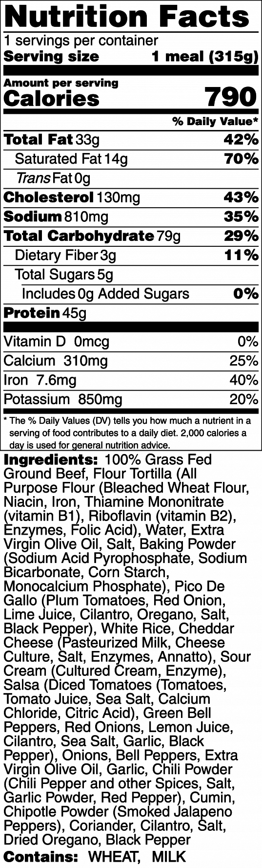 100% Grass Fed Ground Beef, Flour Tortilla (All Purpose Flour (Bleached Wheat Flour, Niacin, Iron, Thiamine Mononitrate (vitamin B1), Riboflavin (vitamin B2), Enzymes, Folic Acid), Water, Extra Virgin Olive Oil, Salt, Baking Powder (Sodium Acid Pyrophosphate, Sodium Bicarbonate, Corn Starch, Monocalcium Phosphate), Pico De Gallo (Plum Tomatoes, Red Onion, Lime Juice, Cilantro, Oregano, Salt, Black Pepper), White Rice, Cheddar Cheese (Pasteurized Milk, Cheese Culture, Salt, Enzymes, Annatto), Sour Cream (Cultured Cream, Enzyme), Salsa (Diced Tomatoes (Tomatoes, Tomato Juice, Sea Salt, Calcium Chloride, Citric Acid), Green Bell Peppers, Red Onions, Lemon Juice, Cilantro, Sea Salt, Garlic, Black Pepper), Onions, Bell Peppers, Extra Virgin Olive Oil, Garlic, Chili Powder (Chili Pepper and other Spices, Salt, Garlic Powder, Red Pepper), Cumin, Chipotle Powder (Smoked Jalapeno Peppers), Coriander, Cilantro, Salt, Dried Oregano, Black Pepper