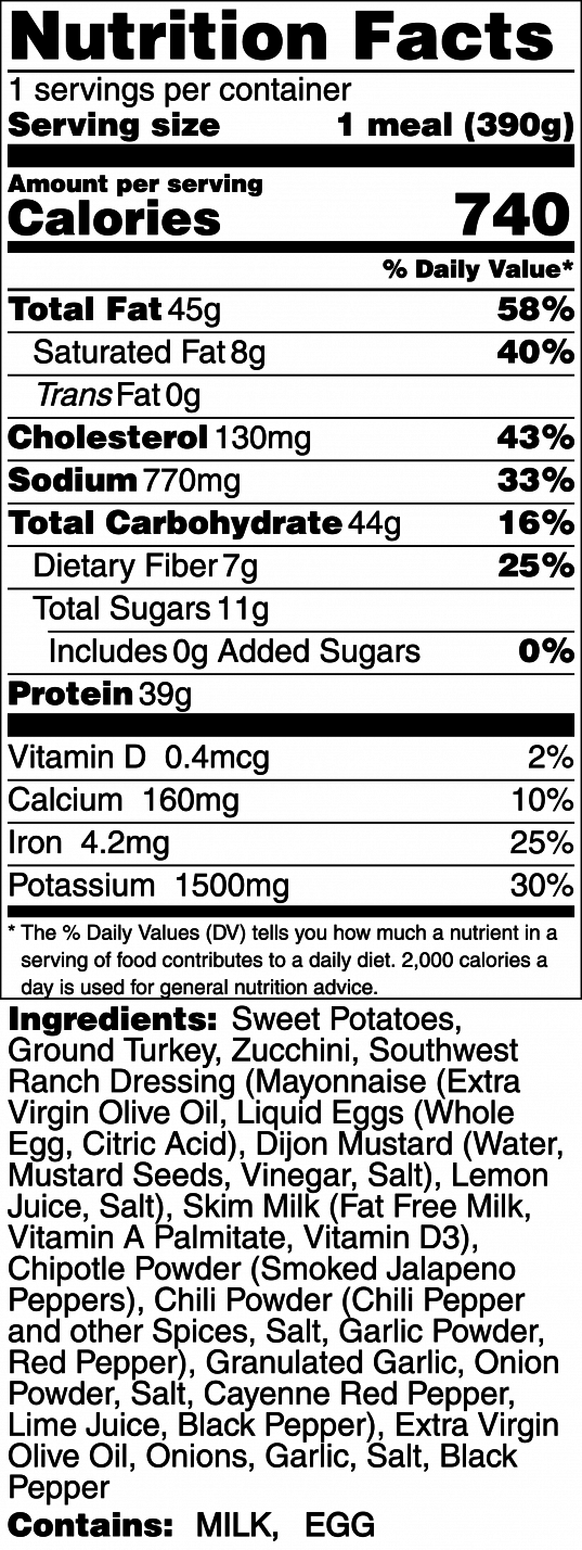 Sweet Potatoes, Ground Turkey, Zucchini, Southwest Ranch Dressing (Mayonnaise (Extra Virgin Olive Oil, Liquid Eggs (Whole Egg, Citric Acid), Dijon Mustard (Water, Mustard Seeds, Vinegar, Salt), Lemon Juice, Salt), Skim Milk (Fat Free Milk, Vitamin A Palmitate, Vitamin D3), Chipotle Powder (Smoked Jalapeno Peppers), Chili Powder (Chili Pepper and other Spices, Salt, Garlic Powder, Red Pepper), Granulated Garlic, Onion Powder, Salt, Cayenne Red Pepper, Lime Juice, Black Pepper), Extra Virgin Olive Oil, Onions, Garlic, Salt, Black Pepper