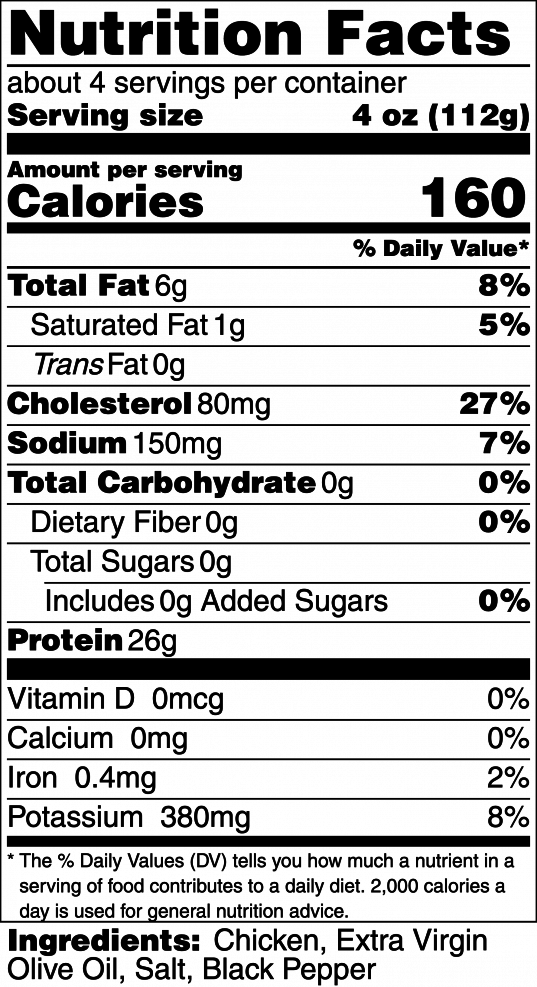 Lean chicken breast is sautéed in extra virgin olive oil and lightly seasoned with salt and pepper.