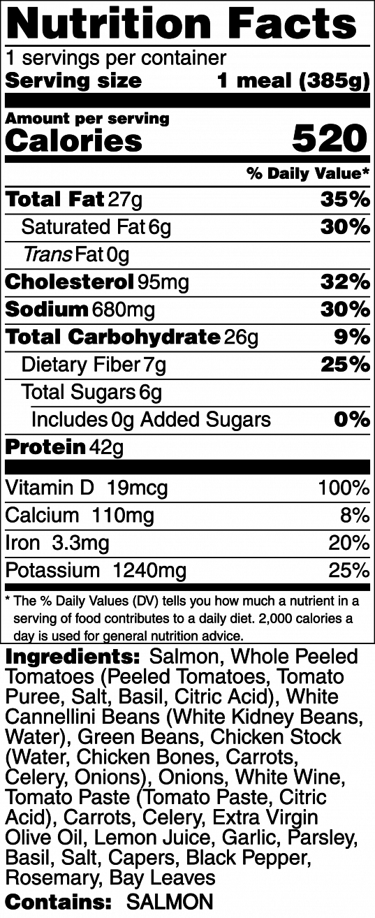 Roasted salmon over a rustic Tuscan style stewed beans featuring white beans, green beans, tomatoes, capers, fresh herbs, lemon, extra virgin olive oil, and a splash of white wine.